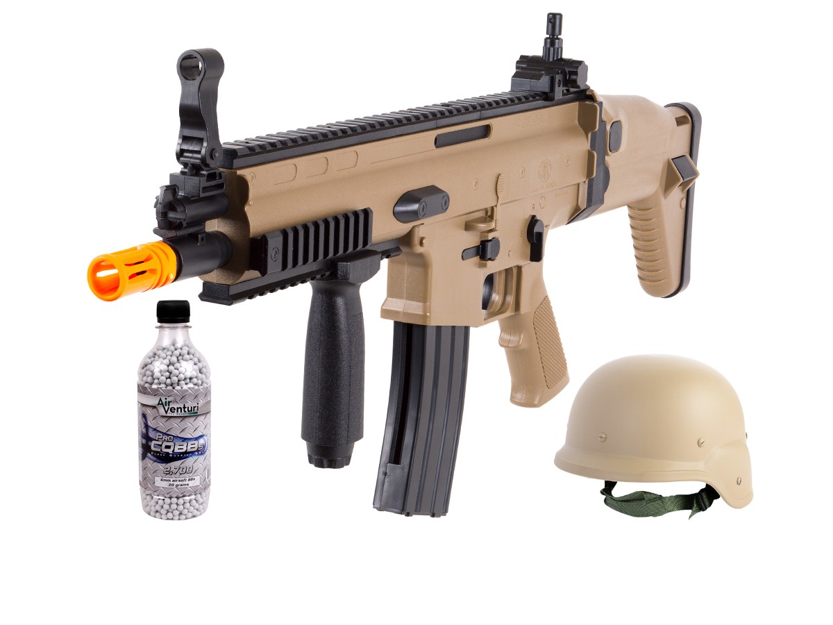 FN Herstal SCAR-L Spring Airsoft Rifle Kit, Tan 6mm. FN Herstal SCAR-L Spring Airsoft Rifle Kit Officially licensed by FN Herstal Full-sized replica Spring powered 350 round, high capacity magazine Flip-up front & rear sights Tactical foregrip Folding stock Functioning charging handle Includes Replica M9 plastic tan helmet and 2,700 Air Venturi pro CQBBs white airsoft BBs, 0.20g